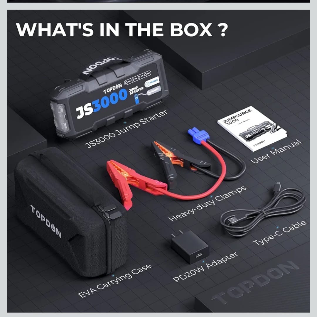 1*JS3000 Jump Starter; Cable; Clamp; EVA Carrying Case; User Manual